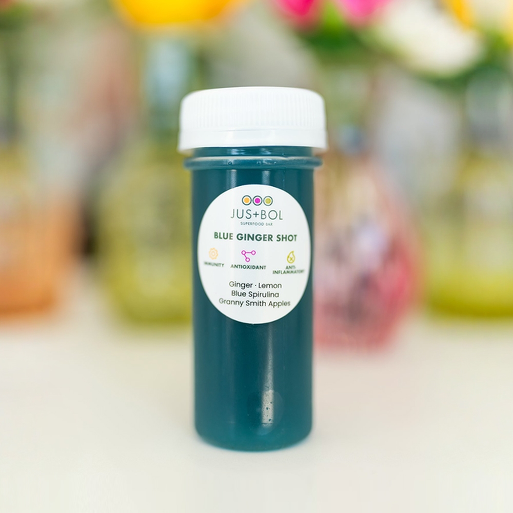 Our Blue Ginger Shot is crafted with a powerful blend of blue spirulina, fresh ginger, lemon, and other natural ingredients known for their health-boosting properties.