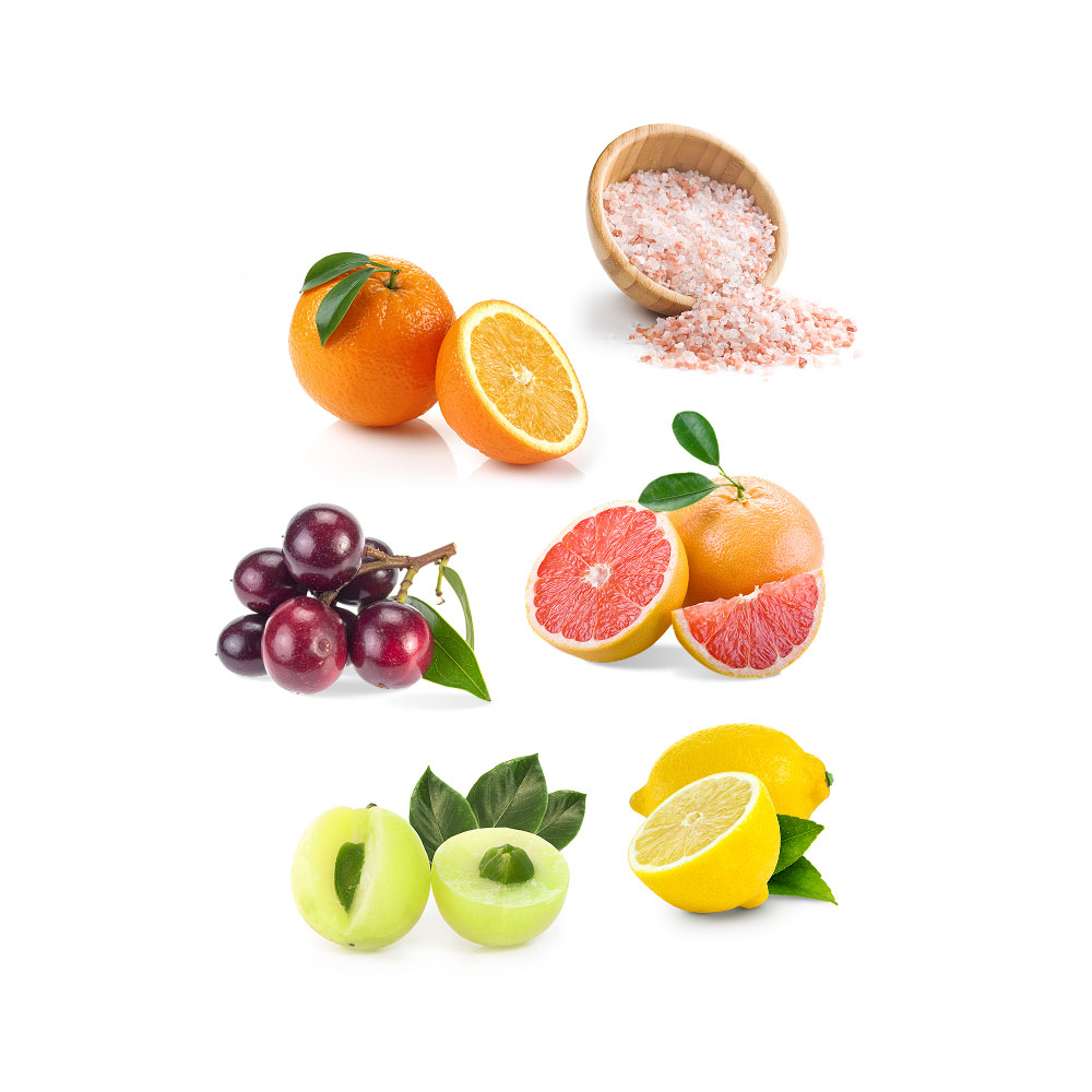 It’s made with lemon, orange, grapefruit, amla berry, camu camu, and Himalayan pink salt—each chosen for their immune-boosting and skin-nourishing benefits.