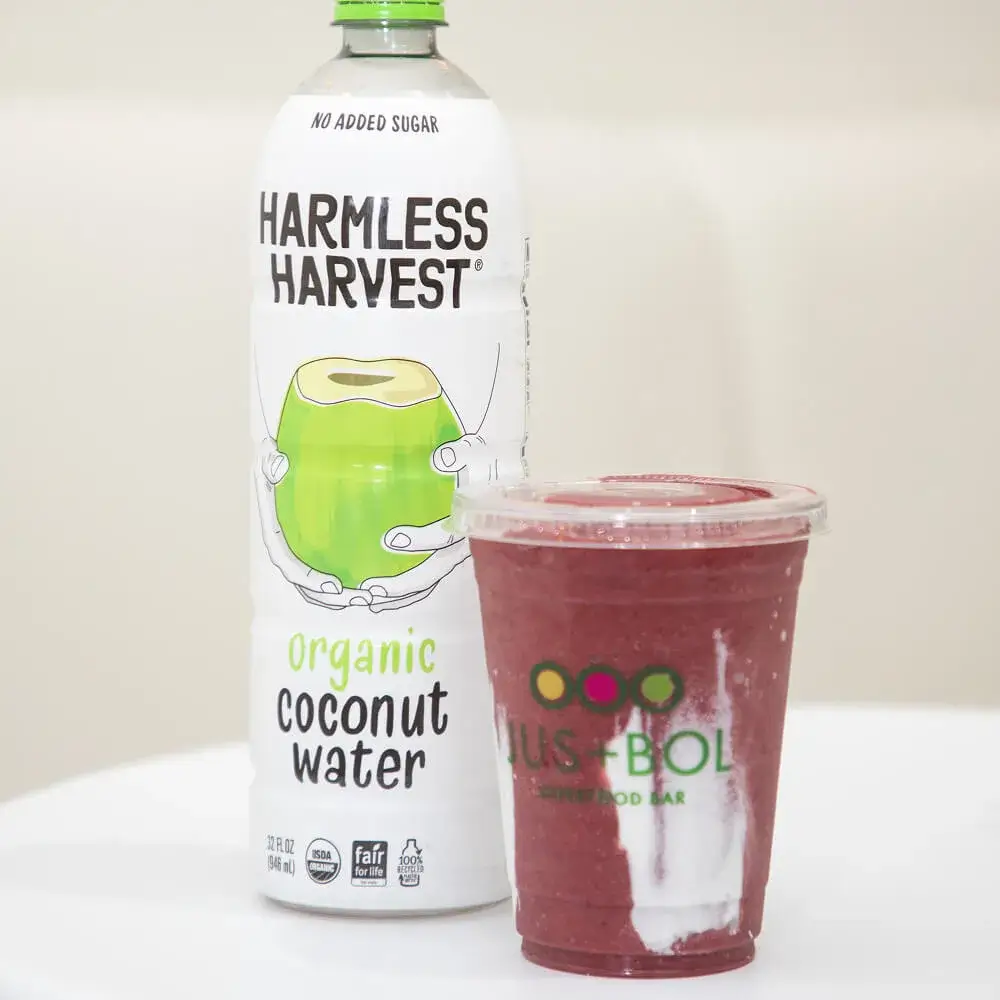 The Island Escape smoothie from JUS+BOL Superfood Bar is a luscious and rejuvenating blend, designed to transport you to a serene tropical paradise. This smoothie features the deep, rich flavor of dark cherries paired with the sweet, tangy taste of pineapple, creating a delightful fruit medley. Coconut water and almond mylk provide a hydrating and creamy base, while grass-fed collagen adds a boost of protein and supports healthy skin, hair, and joints. Coconut butter and homemade coconut cream infuse the smoothie with a rich, velvety texture and a luxurious coconut flavor. The Island Escape smoothie is a perfect blend of indulgence and nutrition, offering a refreshing and nourishing escape from your everyday routine.