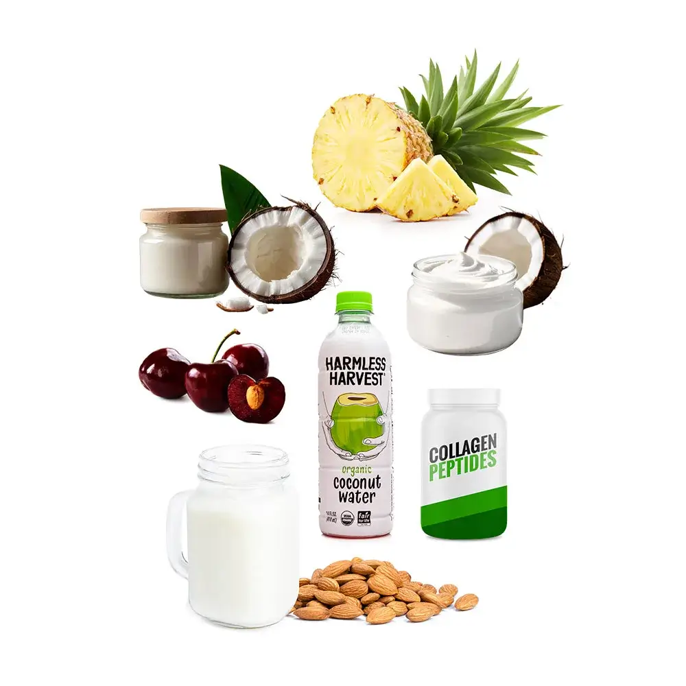 Dark Sweet Cherries, Pineapple, Harmless Harvest Coconut Water, Almond Mylk, Collagen Peptides, Coconut Butter, Coconut Cream